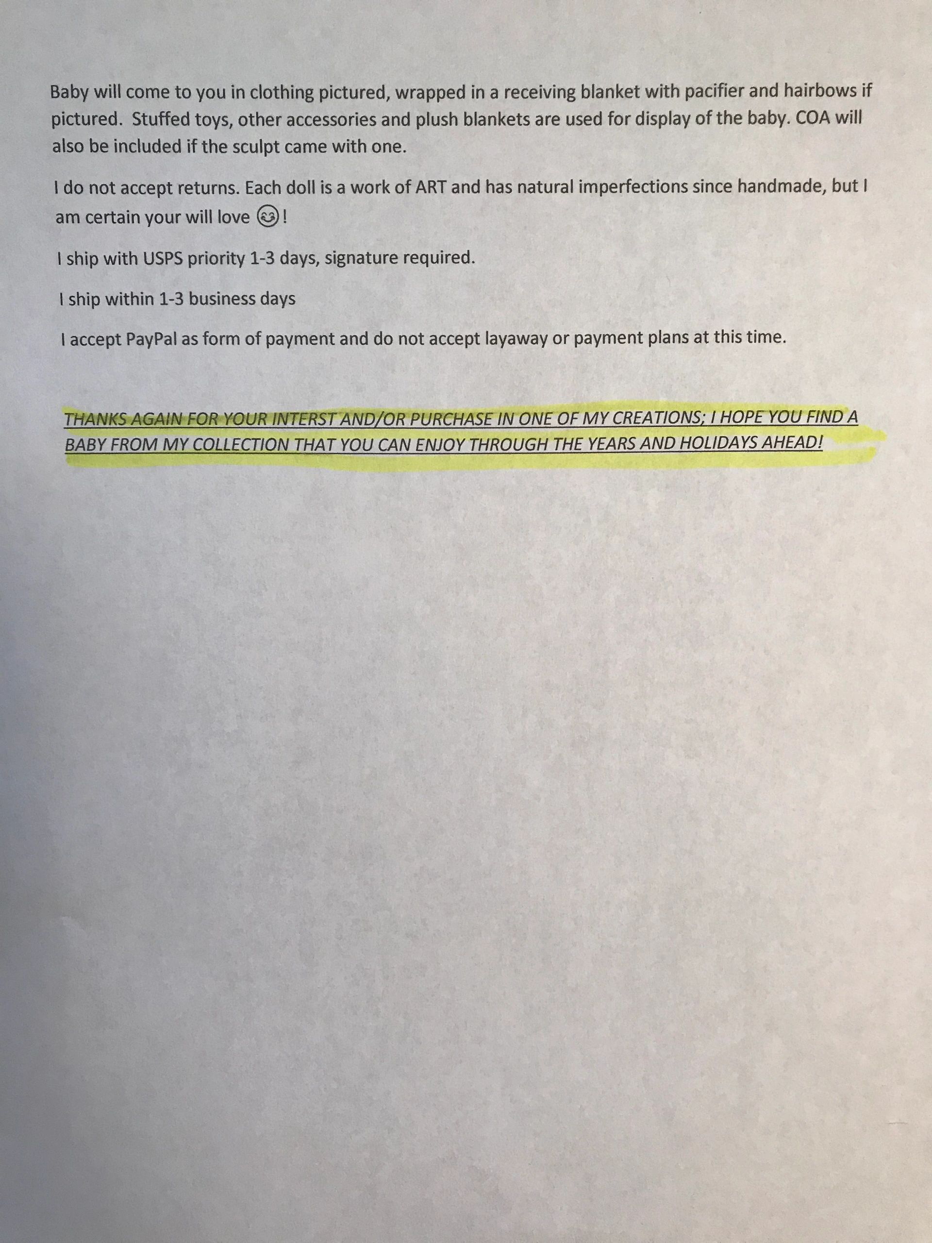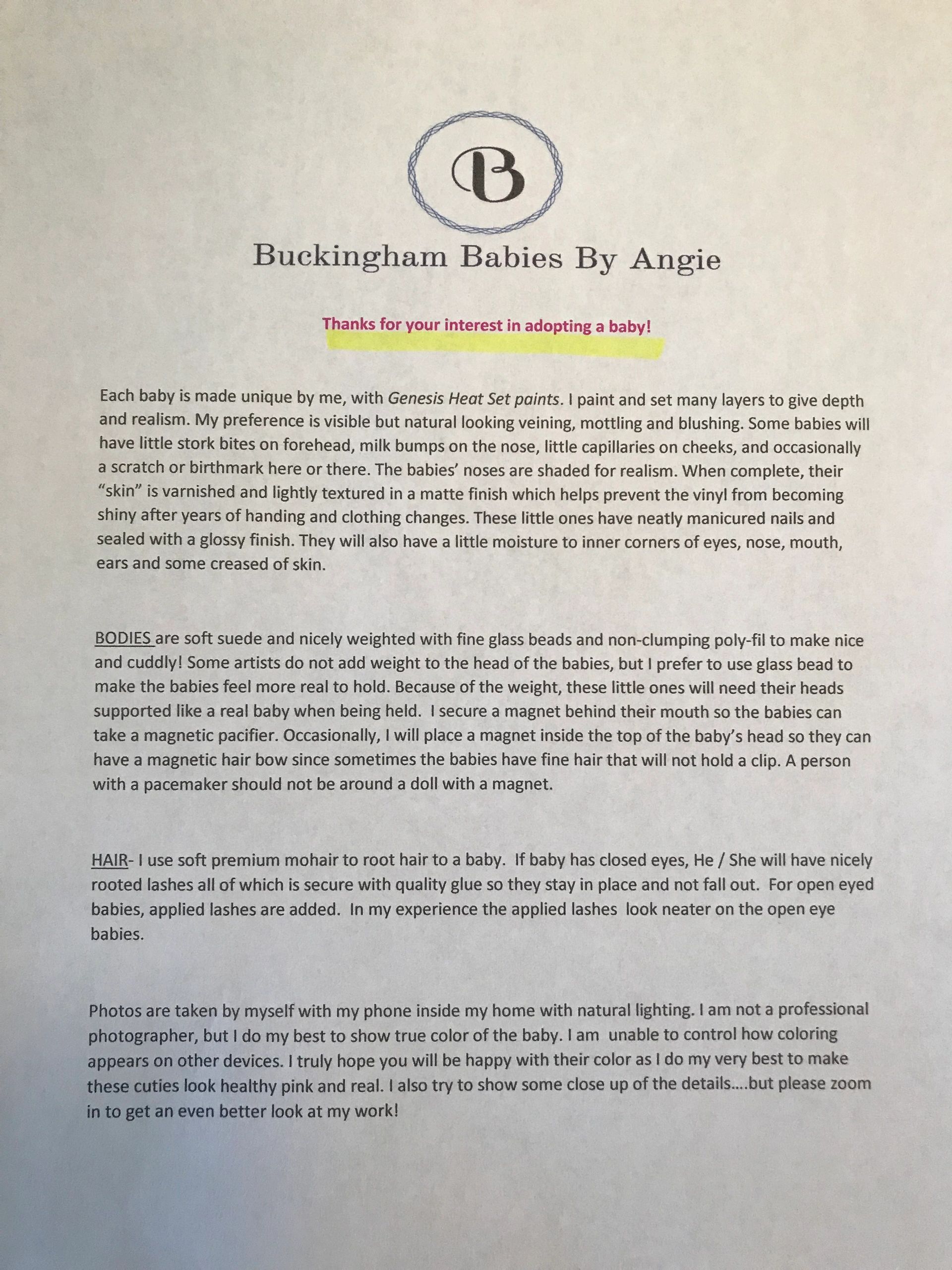 While shopping with me, I want you to be completely happy with the experience. If you have questions about the Reborn baby dolls, shipping, or payment please ask. I hope you continue to shop with me for many years to come. There will be many Buckingham Babies waiting for new homes!